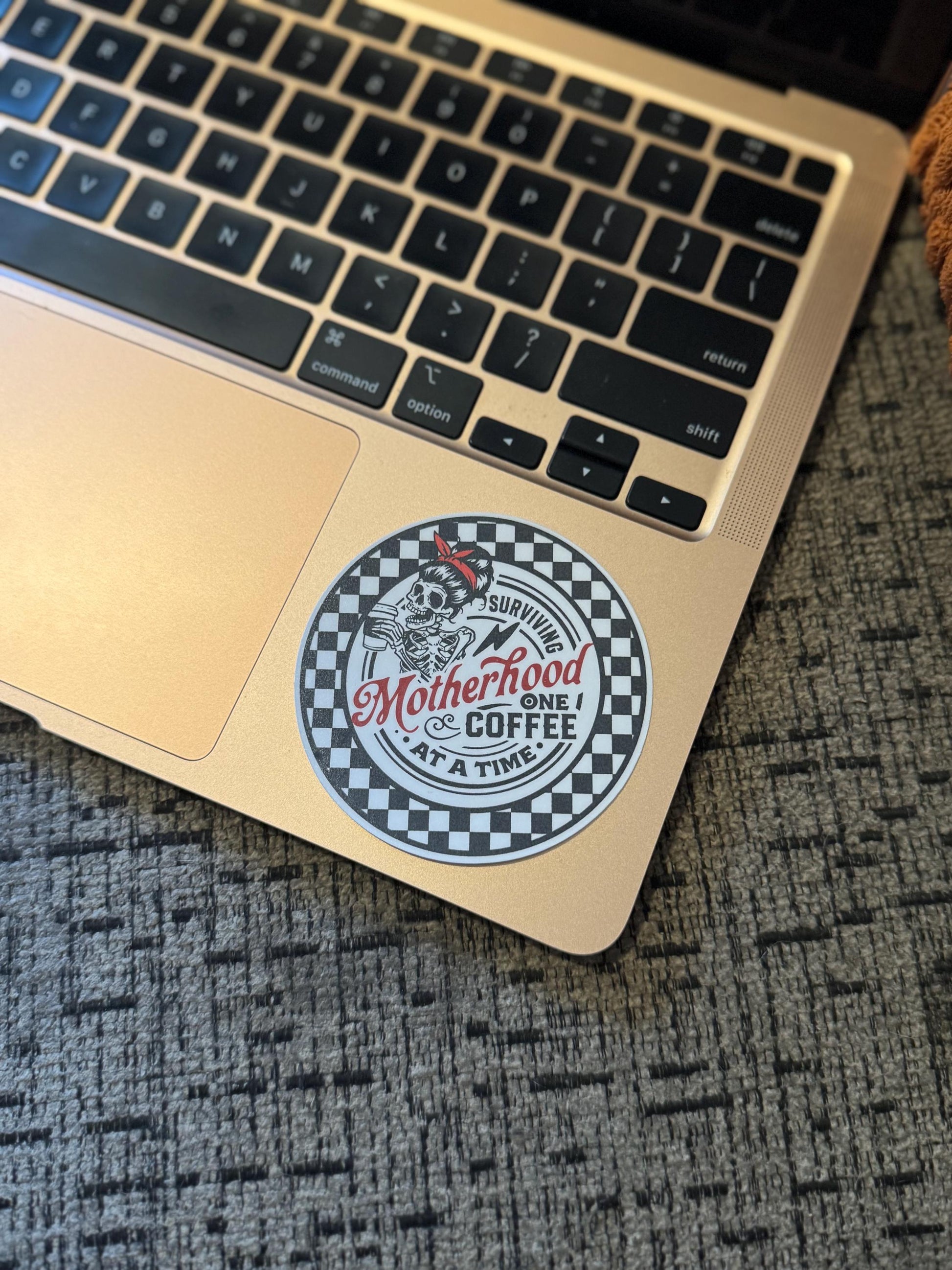 Surviving Motherhood Sticker – Caffeinated, Funny, and Handmade with Love
